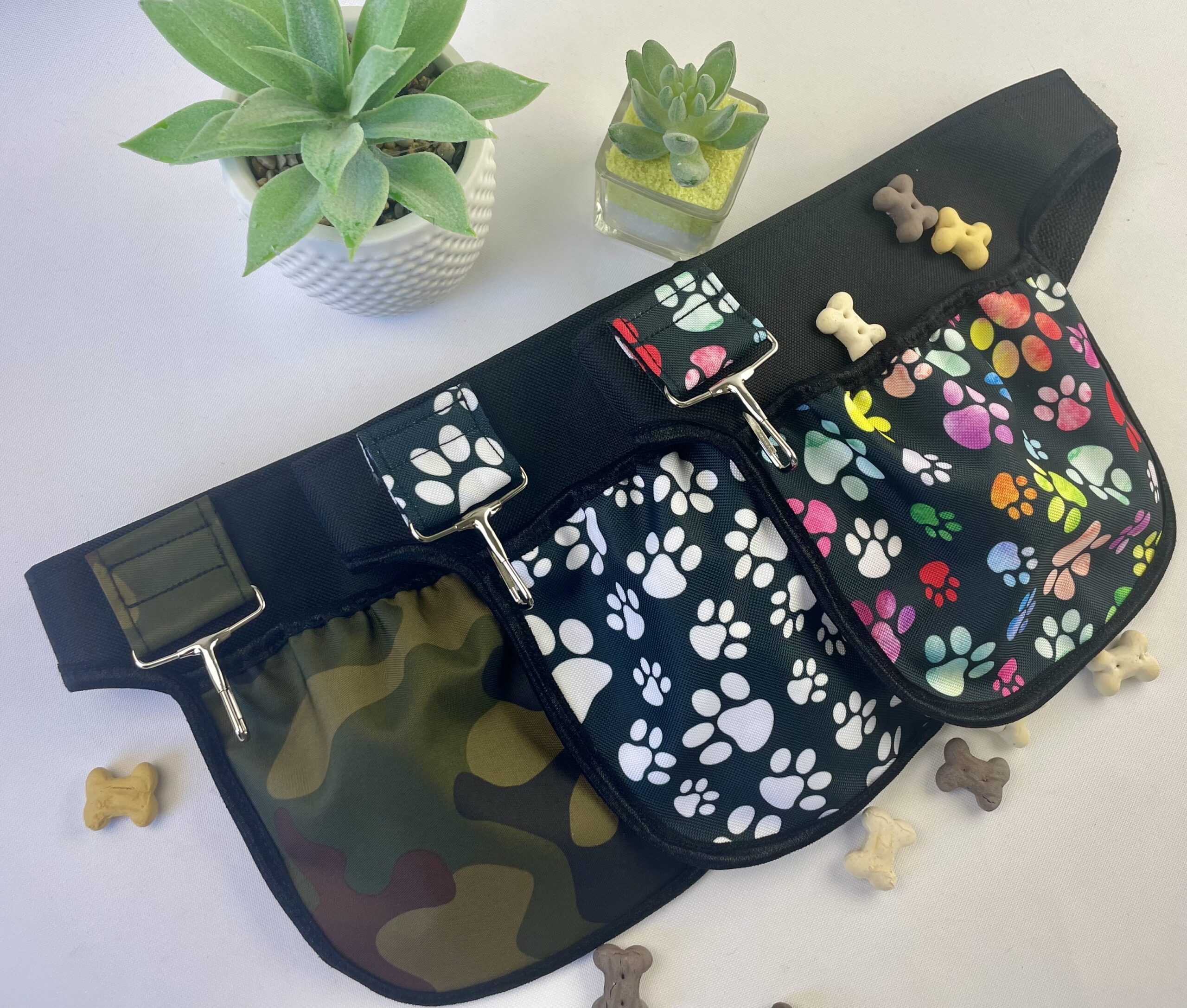 Pamlskovník, jehož oblé dno usnadňuje vyjmutí pamlsku, je určen k nošení kolem pasu. Součástí je všitá karabinka pro uchycení klíčů či zásobníků na sáčky. Chceš ladit se svým čtyřnohým parťákem? Obojek ve stejném vzoru je pak jasná volba.